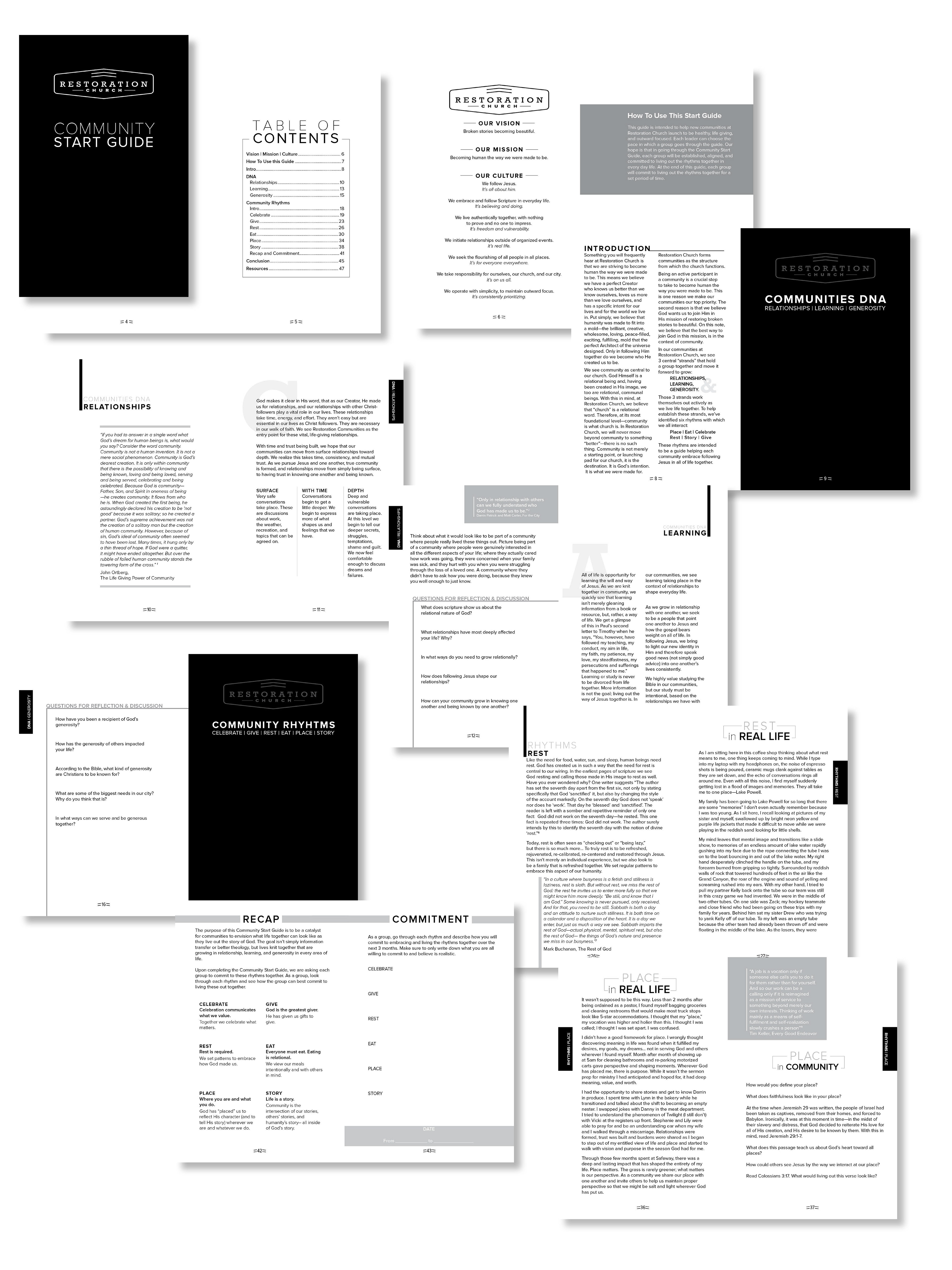 Restoration Church wrote a manual to help their Community Groups start on the same page. Using their copy, I designed the book that allows each member to have at their fingertips the DNA of the church.